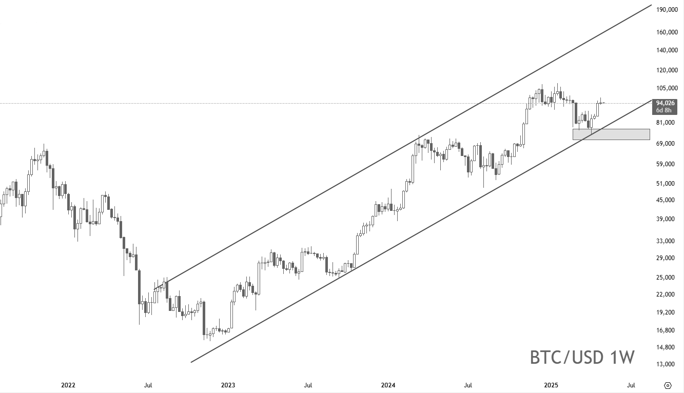 Savaitinėje diagramoje matome svarbų palaikymo zoną, esančią 69 000–72 000 USD diapazone, kur kaina keletą kartų atšoko, kas rodo stiprią pirkimo paklausą šioje srityje. Kita vertus, viršutinė kanalo riba, artėjanti prie 105 000 USD žymos, veikia kaip pasipriešinimas.