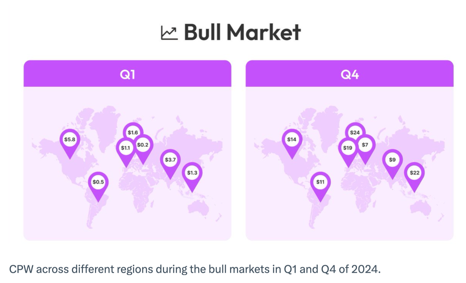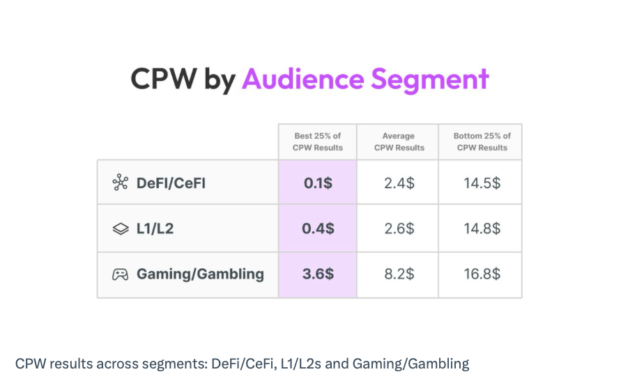 „Žaidimų ir azartinių lošimų kampanijos yra brangiausios, kurių vidutinė CPW yra 8,74 USD, o apatinis kvartilis – 3,40 USD“, – teigė Web3 rinkodaros įmonės „Addressable“ vienas iš įkūrėjų Asafas Nadleris neseniai paskelbtoje ataskaitoje X. CPW arba kaina už piniginę laikomas „kokybiškesniu“ rodikliu, nes jis seka svetainės lankytojų, kurių naršyklėje jau įdiegta kriptovaliutų piniginė, kainą.
